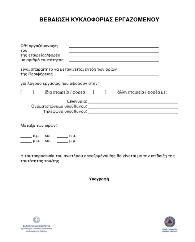 Η βεβαίωση τύπου Α, που αφορά στις μετακινήσεις των εργαζόμενων, συμπληρώνεται μια φορά και παρέχεται με προσωπική ευθύνη του υπογράφοντος από τον εργοδότη ή τον νόμιμο εκπρόσωπό του σε περίπτωση νομικού προσώπου ή, σε περίπτωση ελεύθερου επαγγελματία ή αυτοαπασχολούμενου, από τον ίδιο.