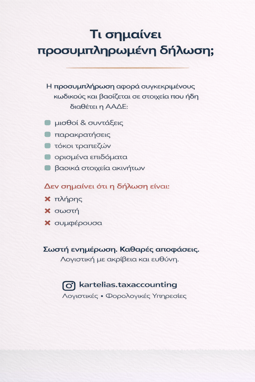 Η προσυμπλήρωση αφορά συγκεκριμένους κωδικούς και βασίζεται σε στοιχεία που ήδη διαθέτει η ΑΑΔΕ.