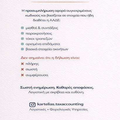 Η προσυμπλήρωση αφορά συγκεκριμένους κωδικούς και βασίζεται σε στοιχεία που ήδη διαθέτει η ΑΑΔΕ. ▫️μισθοί & συντάξεις ▫️παρακρατήσεις ▫️τόκοι τραπεζών ▫️ορισμένα επιδόματα ▫️βασικά στοιχεία ακινήτων Δεν σημαίνει ότι η δήλωση είναι πλήρης και σωστή. Τα κρίσιμα σημεία που…